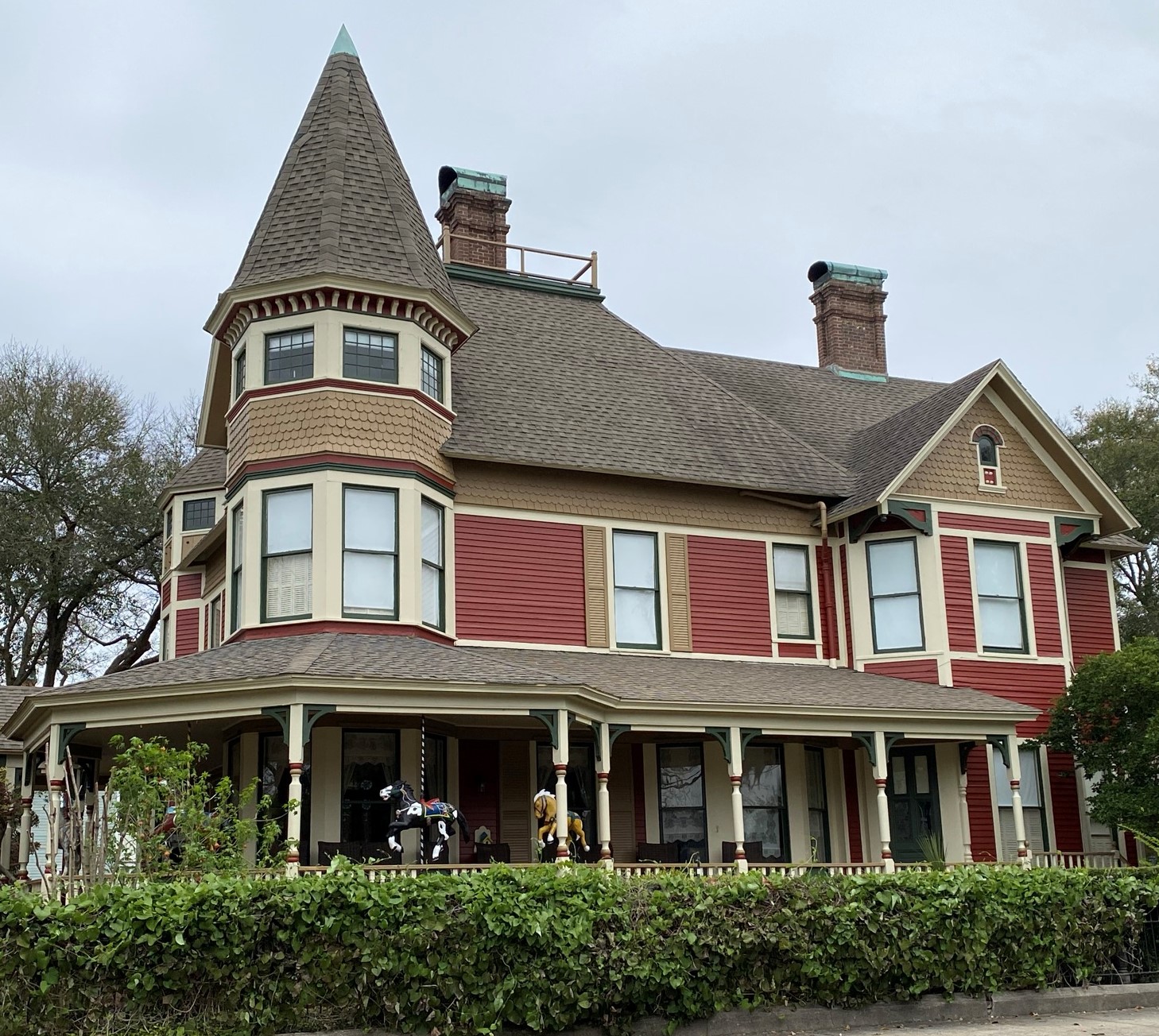 The Bailey House, built in the Queen Anne style, is one of the many beautiful properties found in Fernandina Beach. Once a bed and breakfast inn, it is currently for sale. It is worth a look and photo opportunity; check out the carousel horse figures hanging from the circular porch front.