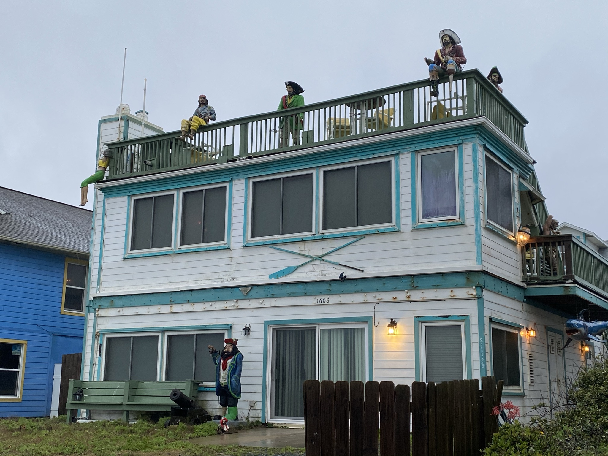 Not far down the road is another curiosity—the privately occupied Pirate House, listed on Roadside America. This home has pirate statues peering toward the beach, along with a great white shark hanging below its first-level deck.