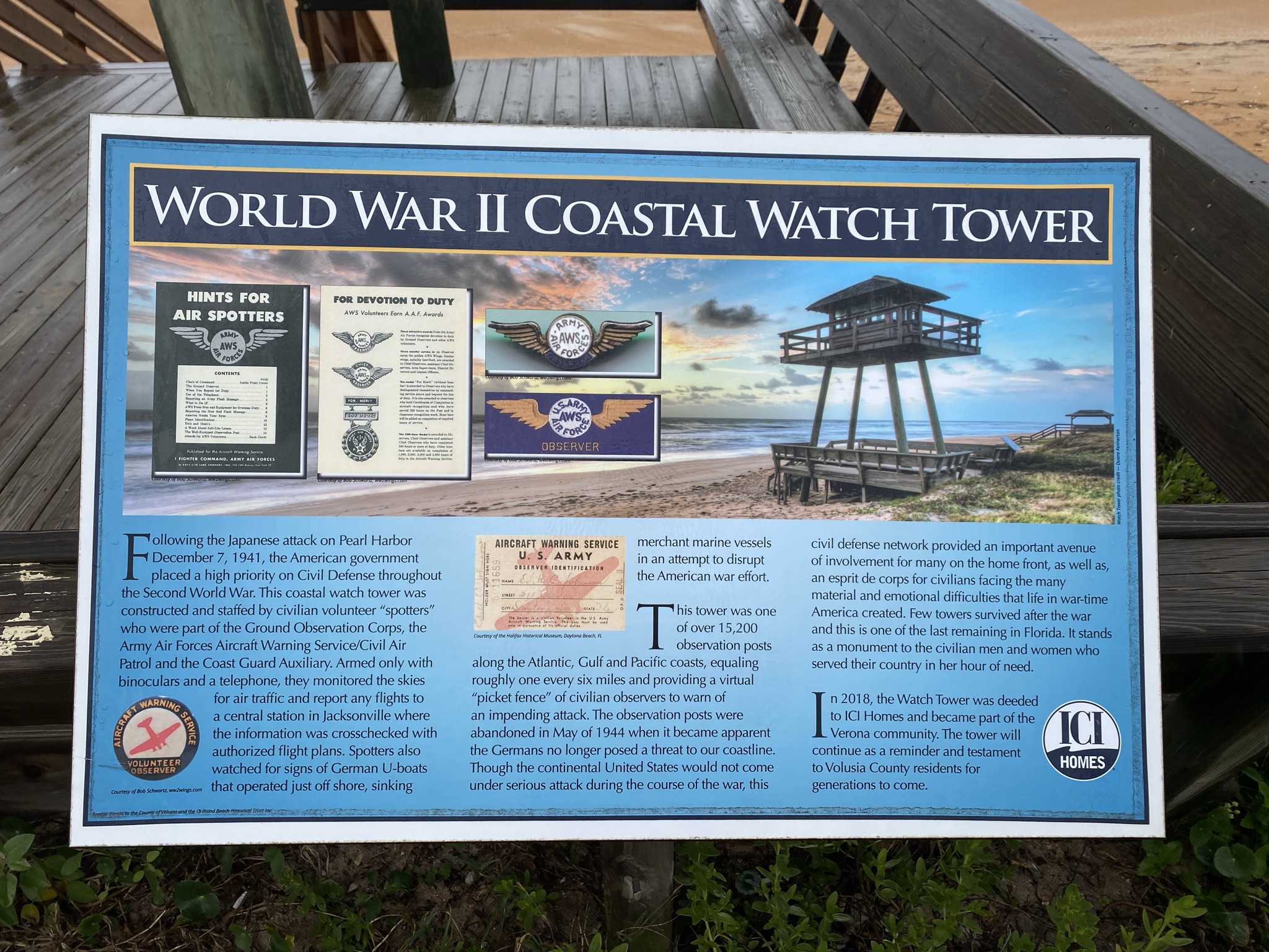 Now a rare sight, Ormond-by-the-Sea has one of three watchtowers left in Florida; the other two, located in Melbourne Beach and Stuart, are also along A1A. Atlas Obscura provides a write-up on the watchtower. A brief read on the watchtower, its restoration efforts, and a plea for a return of a sign marker, is provided by Volusia County-based Hometown News: “U-Boats off the Volusia Coast” by Dan Smith (November 9, 2017).