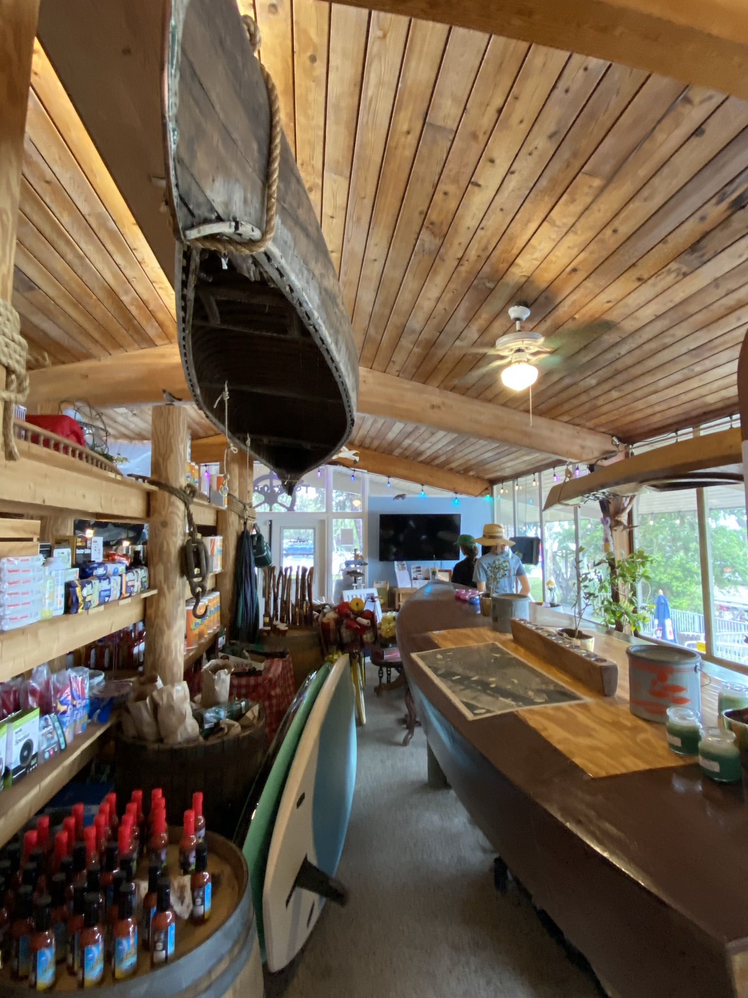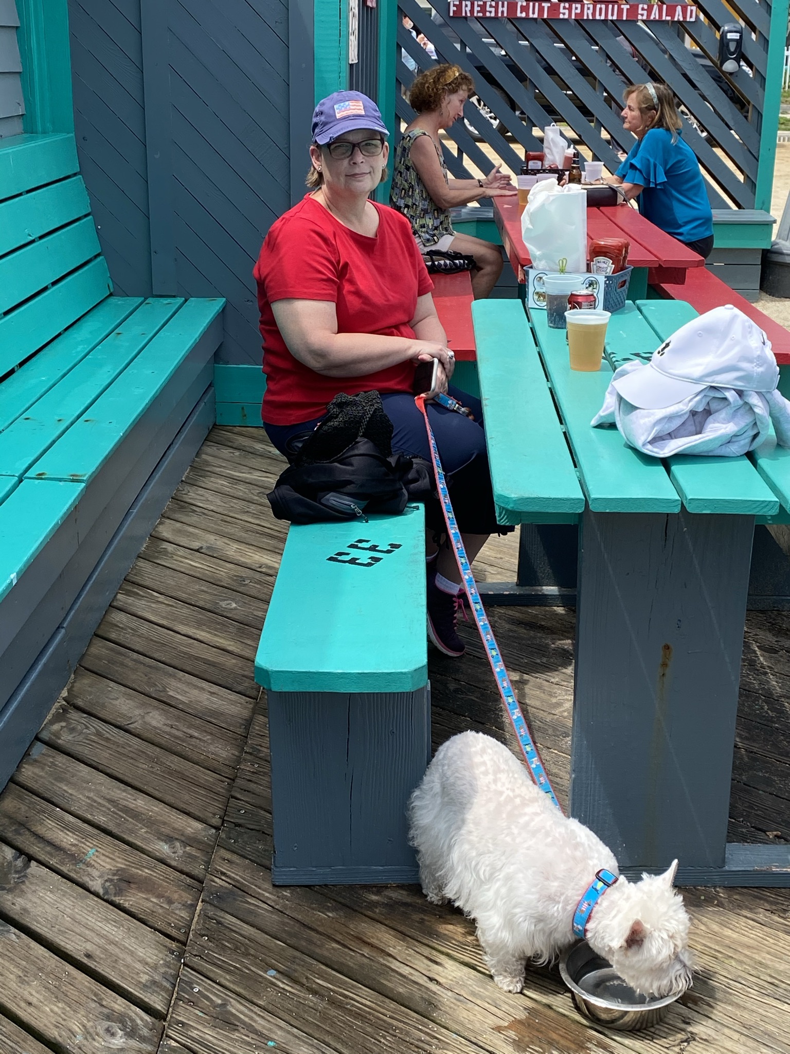 Other than a bit of barking quieted by a taste of a hushpuppy, Oliver followed the rules. Larcy, not a fan of seafood, enjoyed a mushroom swiss burger with onion rings, while I hit the light sides list, consuming a bowl of clam chowder and coconut shrimp with spicy raspberry dipping sauce. I later ordered two hushpuppies to finish off the sauce. High Tides at Snack Jack is also where I bought my t-shirt for the day (awesome designs).