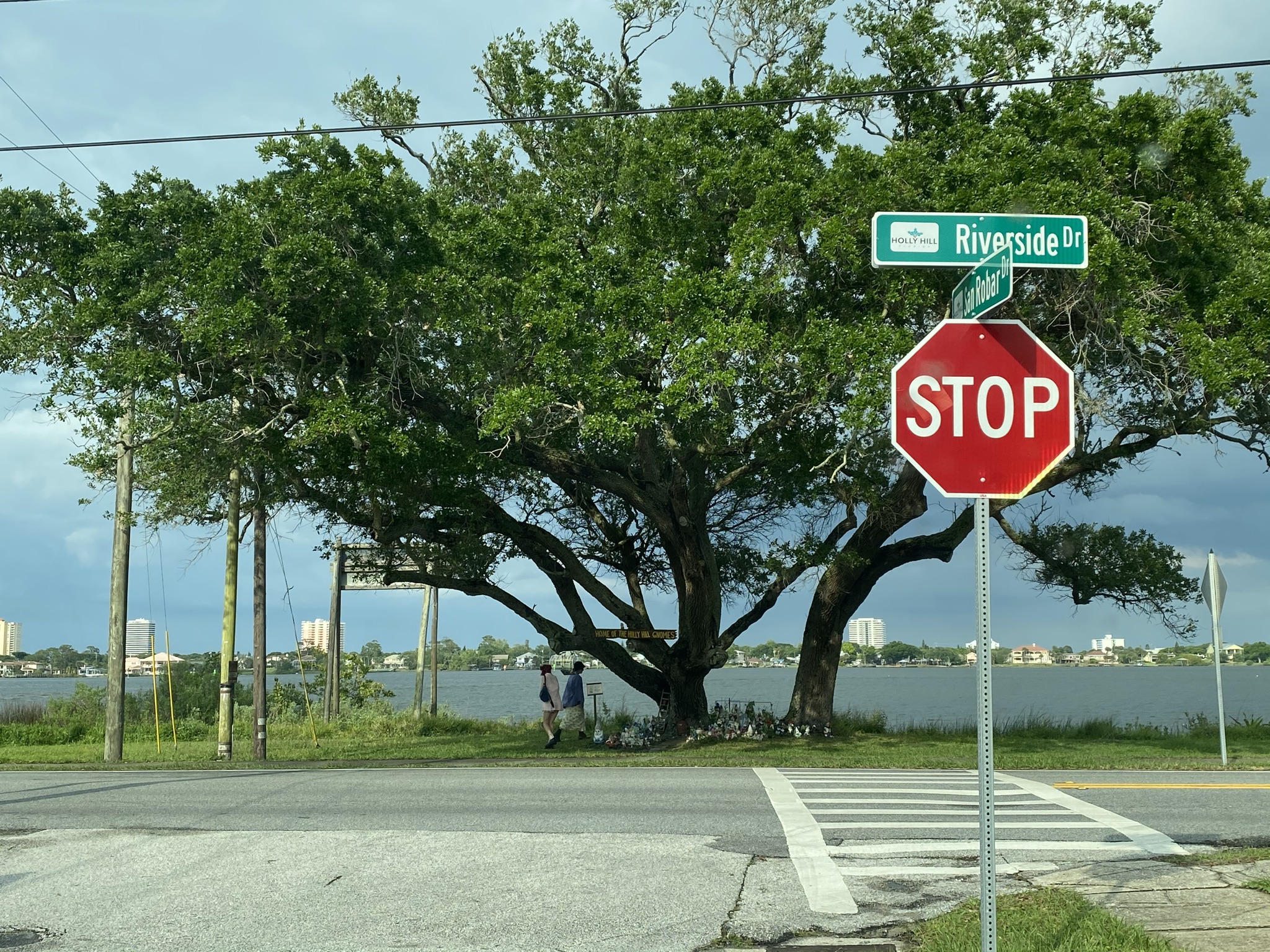 However, we turned right and crossed over the Granada Bridge again to explore curiosities west of the Halifax River. We turned onto South Beach Street, which later becomes Riverside Drive; soon, we arrived at the Holly Hill Gnome Tree.