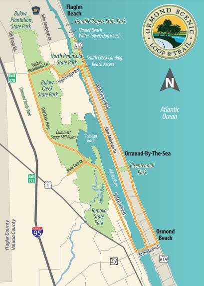 There are several ways to access the loop; from the north, Exit 278 off I-95 will put you onto Old Dixie Highway, where you can continue south or cross Walter Boardman Lane and High Bridge Road eastward. From the south, take US 1 North to SR 40/West Granada Boulevard and turn right; a left turn on the North Beach Street portion of Old Dixie Highway just before the Granada Bridge will put you on the loop.