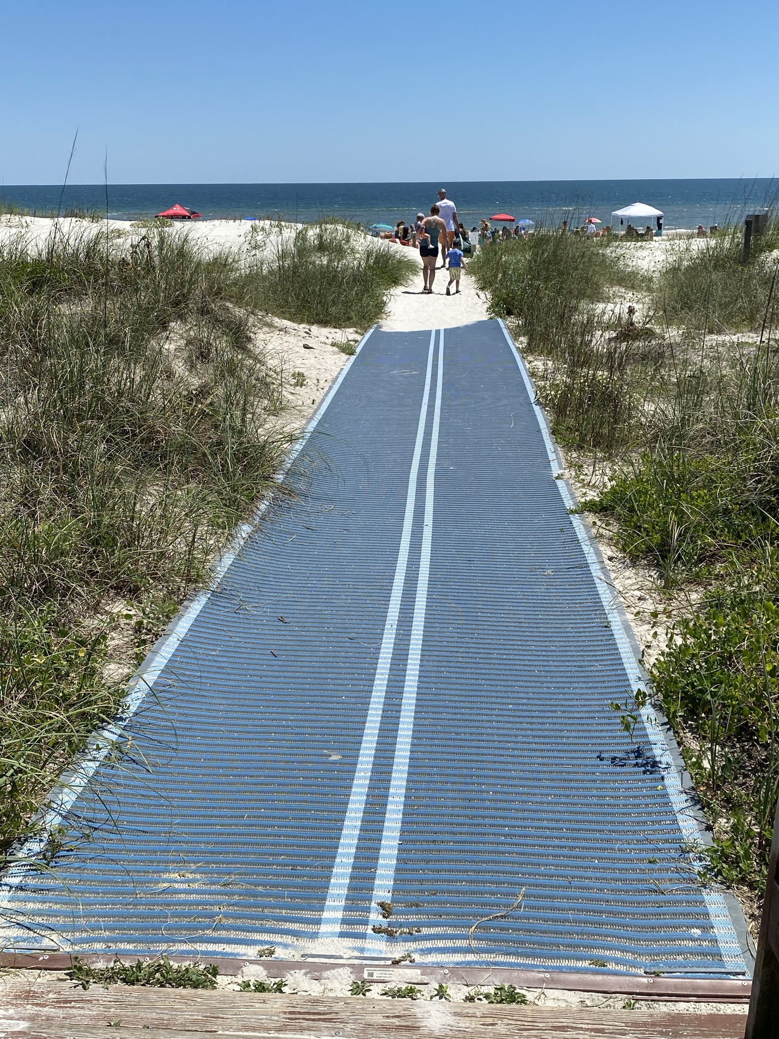 “The City of Fernandina Beach has a Mobi-Mat semi-permanently installed at the Main Beach boardwalk access ramp. This environmentally-friendly ADA-compliant matting provides safe and easy access for wheelchairs, strollers, and walkers to maneuver on the beach sand. The matting is made completely from recycled plastic bottles.“