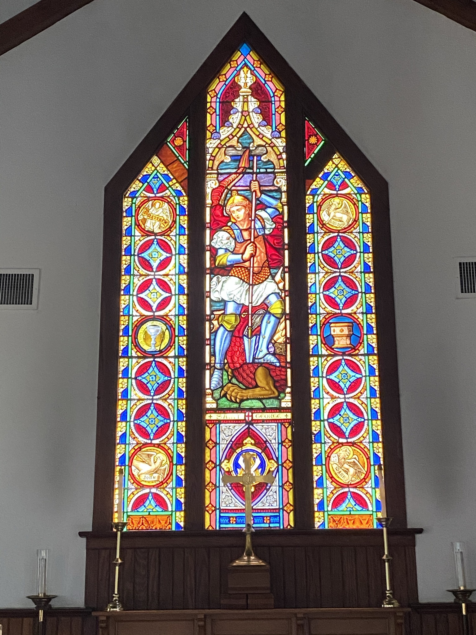 The stained glass window above the altar, put in place in 1884, depicts St. George slaying his dragon. A stopover here might also provide a chance to see some of the island’s peacocks known to roam the church grounds.