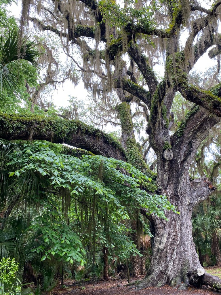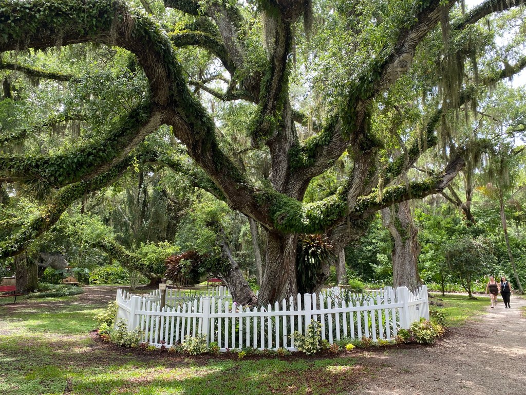 Once known as Confederate Oak, this majestic live oak is located at Dunlawton Sugar Mill Gardens in Port Orange. This botanical garden has allowed nature to take over manmade existence twice; once after the sugar plantation was destroyed during the Second Seminole War in 1836, and after the 1952 closing of Bongoland, a failed amusement park that featured dinosaur statues throughout (a few still remain on the grounds). Though maintained, the gardens offer lush trails to walk through natural habitat.