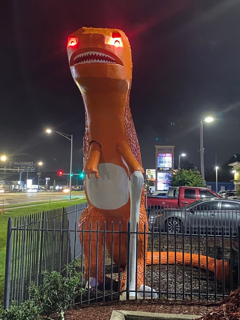 The true star of Beach Boulevard, however, is affectionately known as Rex, the orange dinosaur with eyes glowing red in the evening.