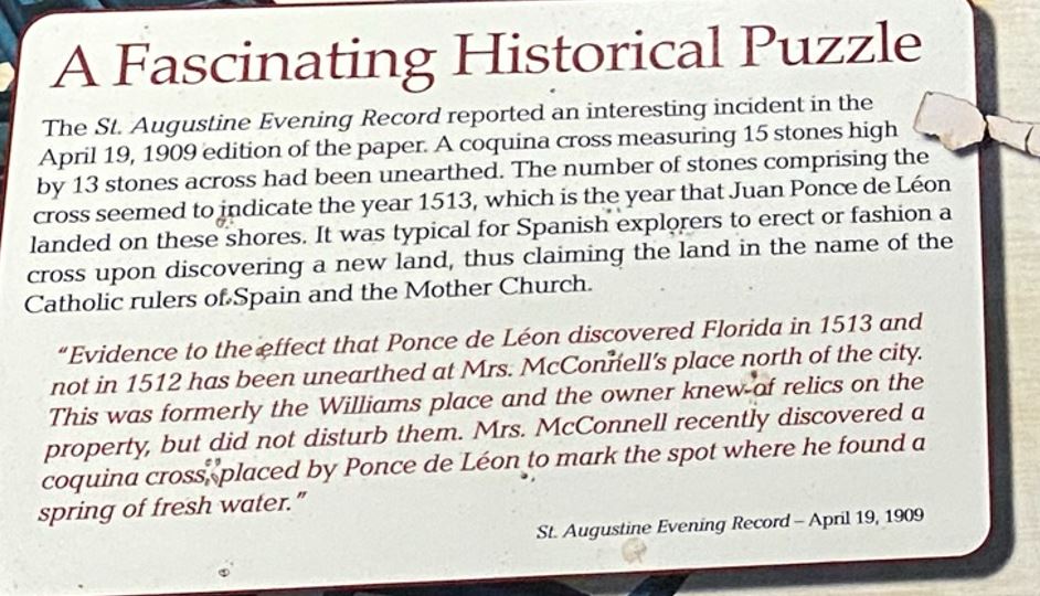 “A cross made of coquina, 15 stones long x 13 stones wide, is unearthed by B.A. Pacetti, an employee of H.H. Williams. Pacetti would sign a legal deposition as to the circumstances under which he found the cross. Unfortunately, Williams was told that coquina was not available on the mainland in 1513, and had the cross re-buried.”