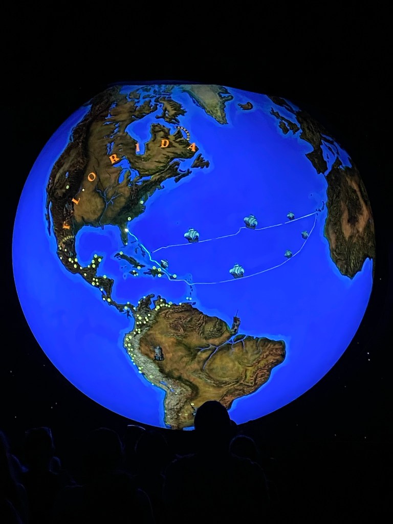 While the planetarium, for me, mainly provided a chance to rest and cool off, Discovery Globe presented a fascinating look at the routes explorers took during their discoveries of the New World. A brief film presentation talks about the history of Discovery Globe, a 30-feet tall rotating globe that in its early days was considered a marvel, attracting long lines of visitors. Not as busy now, and certainly dated, it now provides a sense of nostalgia comparable to that of the older Walt Disney World attractions.