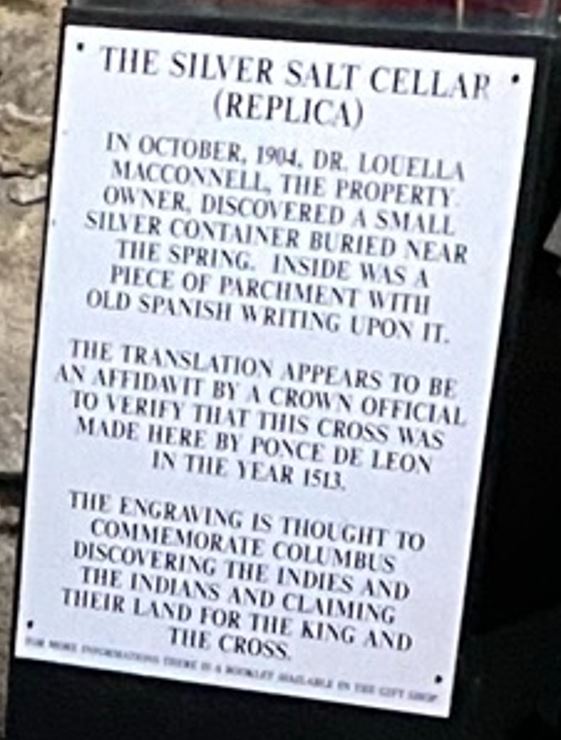 While the fountain is what draws visitors inside the Spring House, there are other interesting things to see. The Coquina Cross of 1513, “supposedly” discovered by the Fountain of Youth’s third owner, Luella Day McConnell, is a cross with 15 vertical and 13 horizontal stones supposedly placed by Ponce de Leon to mark the discovery of the fountain.