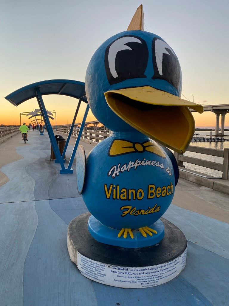 “The Bluebird of Happiness was once a key piece of Vilano Beach’s identity although Vilano Beach was its third home. Shaped as two oranges and painted that sunny hue, the bird helped promote Florida orange juice along a major pre-interstate motor route. In its second move in Vilano Beach, it became the bright blue good-luck totem at Newt’s Motel. In all, the bird was moved four times before coming to an inglorious perch in a local marsh. In 2008, the Main Street Group brought the bird to a sandy lot in the Vilano Beach Town Center where it stands today protected by a “cage” of chain-link fencing. His wings appear to have been clipped, but eventually the Main Street Group hopes to restore the bird as a photo-op icon.”