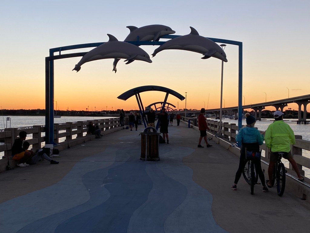 The pier, which also features an archway showing three dolphins, is known as an excellent spot for pier fishing and watching a sunset over the St. Augustine landscape on the opposite side of the Tolomato River.